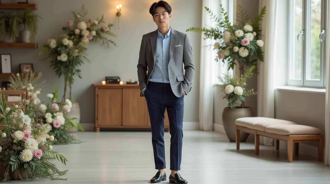 너무 포멀한 구두보다는 깔끔한 로퍼나 블랙 스니커즈도 괜찮아요. 다만! 찢어진 청바지, 반팔, 과한 로고 박힌 옷은… 결혼식장에선 죄송합니다 해야 할 스타일이죠ㅋㅋ 기본만 잘 지켜도 절대 이상해 보일 일 없어요👍