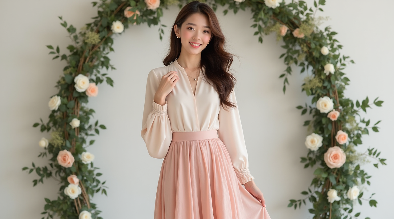 요게 은근 하객룩으로 완성도 높아요. 스커트는 허리 잘록해보이게 A라인이나 주름 있는 스타일로, 상의는 파스텔톤 블라우스나 셔츠 입으면 끝!