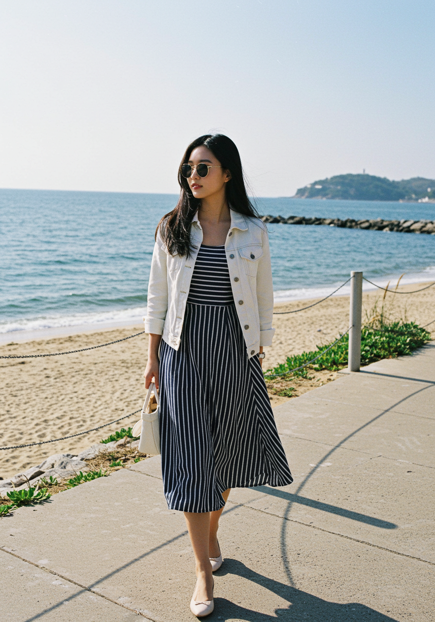8️⃣ 스트라이프 원피스 + 코튼 재킷 🚢