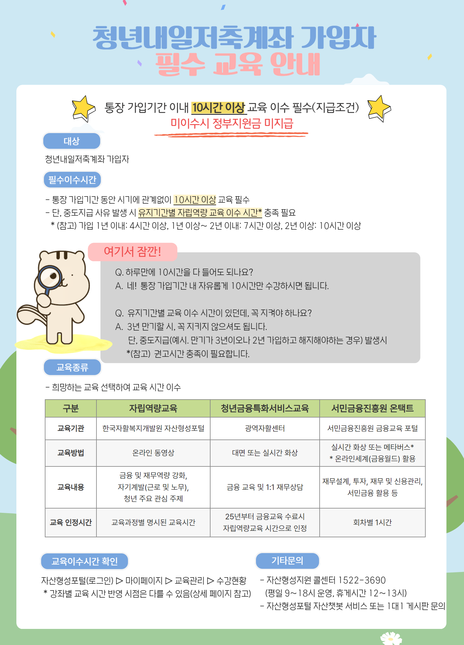 또 자산형성 교육도 연 1회, 총 10시간 받아야 하고, 자금사용계획서도 제출해야 해요.